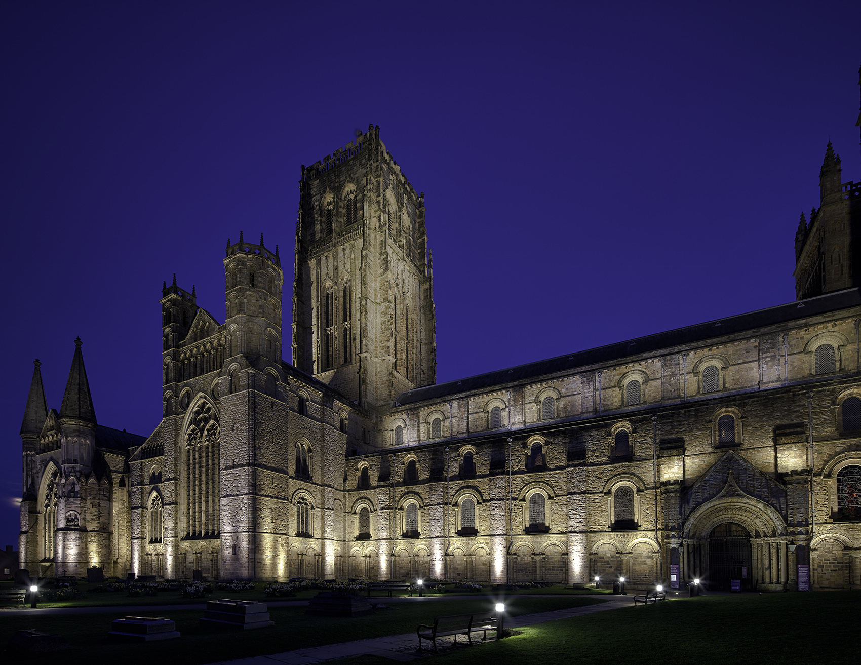 external views of Durham Cathedral floodlit at twilight, Durham City, County Durham, England, UK